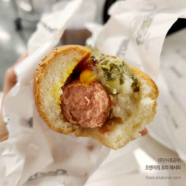 피클과 양배추 소스는 직접 뿌려서 먹는 시스템입니다. 항상 남기지 않고 모두 부어줍니다.
